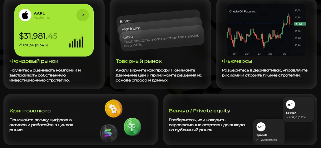 Таким образом, академия предлагает комплексный и практико-ориентированный подход к обучению инвестициям и трейдингу, от базовых знаний до специализации по отдельным сегментам.